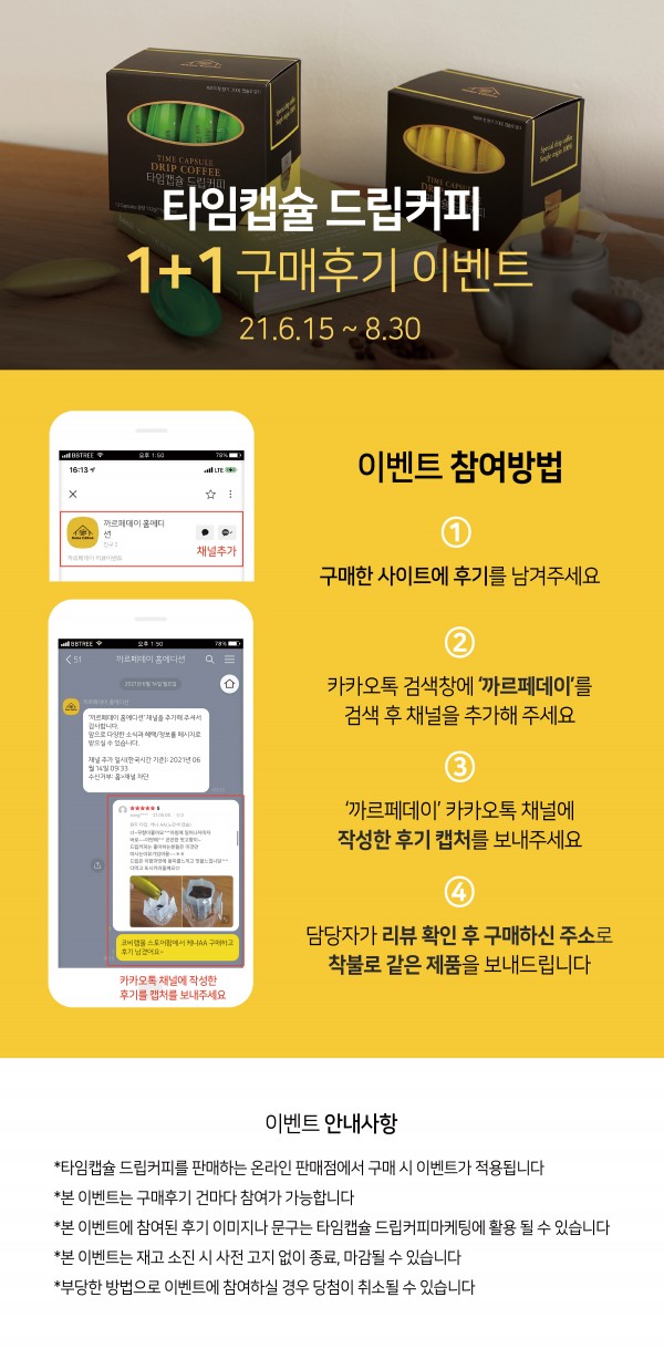 산지의 신선함을 그대로 담은 "타임캡슐 드립커피 1+1 행사" 를 위와 같이 진행하오니, 많은 참여와 관심 부탁드립니다.